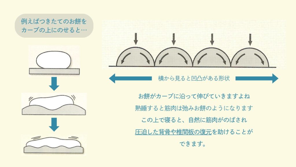 次に”寝る環境”についてですが、#19#20で記したように寝る環境が立った時の姿勢を形作ることになります。正常の方よりも側弯の方は、ただでさえ背骨に対する負荷が強いので余計に意識しなければなりません。人間は熟睡すると筋肉がお餅のように弛みます。泥酔した人や寝付いた赤ちゃんなど、同じ体重にもかかわらず重たく感じる感覚は良い例です。この瞬間にどのような環境で寝ているか次第で体は大きく変化します。仮にふかふかな軟らかいベッドで流行りの高枕をして寝たとすると、腰からお尻にかけて沈むと同時に首から頭は上がった状態になります。日中の負荷を寝た時に回復させる目的が、寝ている時にも強い負荷をかけ続けることになりかねます。よって、なるべく軟らかくない環境・頭を上げない状態で寝ることが好ましいです。当院がお勧めしている寝具は、日本医療研究株式会社の「ヘルシーライン」です。突起構造になっており筋肉が弛んだ際に背骨一個一個の関節を開いて椎間板の回復を助けてくれます。